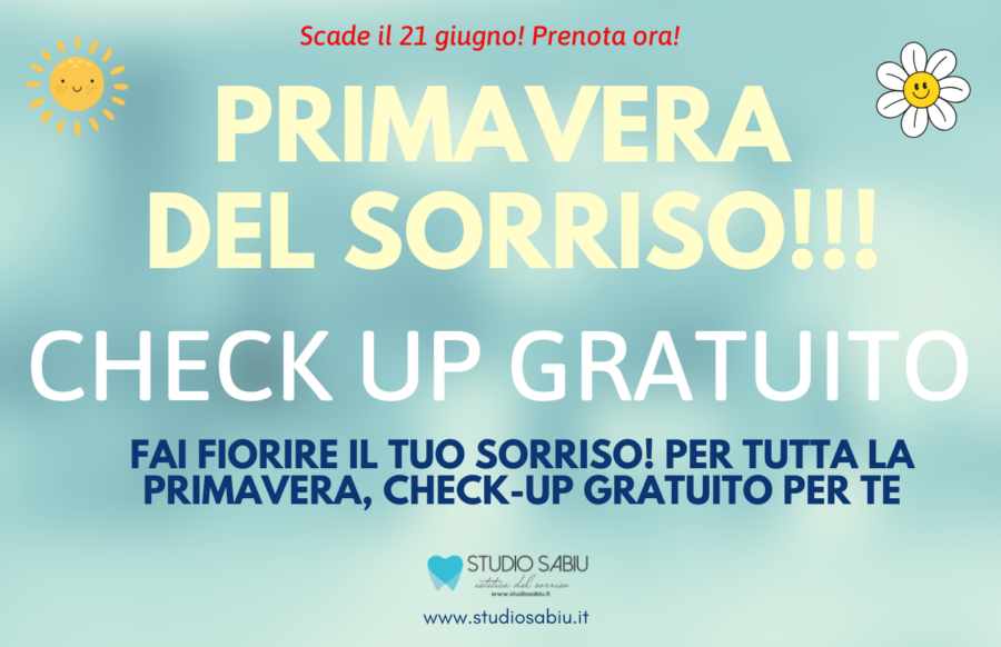 Approfitta della promozione Primavera del Sorriso allo Studio Sabiu di San Giovanni Suergiu. Prima visita e check-up gratuito fino al 21 giugno. Controllo con microscopio, scansione digitale e analisi occlusale. Prenota ora!